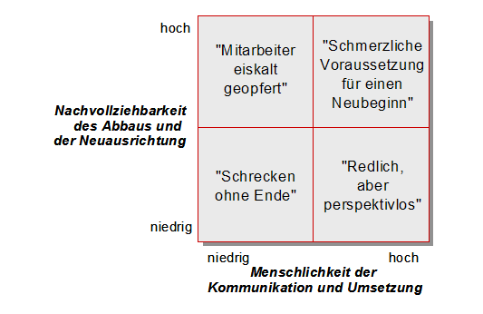 Entscheidend ist dabei, als wie nachvollziehbar, transparent und fair das Vorgehen empfunden wird. Das beginnt damit, dass die Entscheidung zum Personalabbau überzeugend begründet werden muss; es geht weiter mit offener und ehrlicher Kommunikation, und es endet noch nicht mit einer "menschlich anständigen" Umsetzung des Abbaus, sondern erst mit der gemeinsamen Verarbeitung der Erfahrungen und der Entscheidung zu einem Neubeginn. Das heißt in Summe: Die Art und Weise, wie die Krise bewältigt wird, bestimmt sowohl deren emotionale als auch deren betriebswirtschaftliche Nachwirkungen.